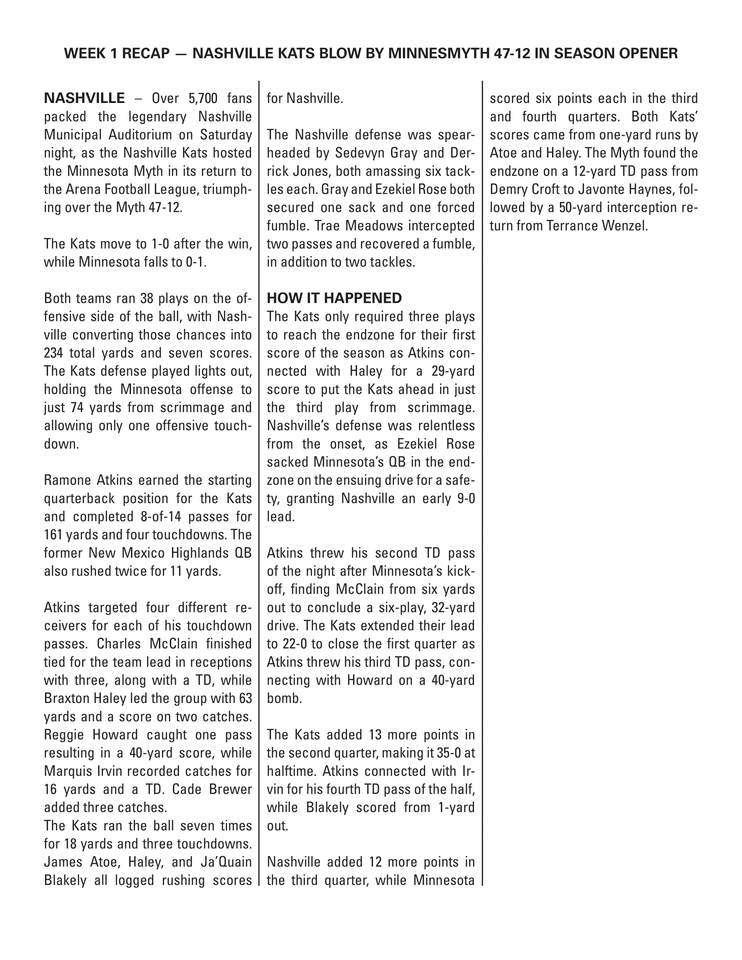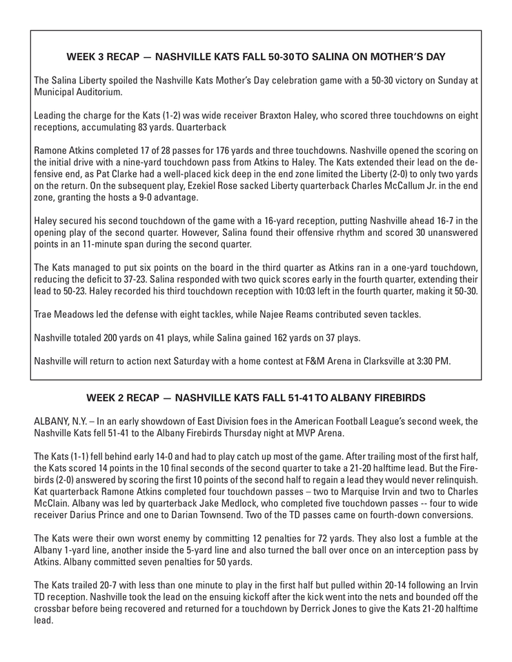 UP NEXT: Nashville will hit the road to meet the Billings Outlaws next Saturday evening (June 8) at First Interstate Arena at 6:00 p.m. MT / 7:00 p.m. CT. The game will be streamed on the new AFL website and YouTube page. Locally, it can be heard on 102.5 and 106.3 FM The Game.