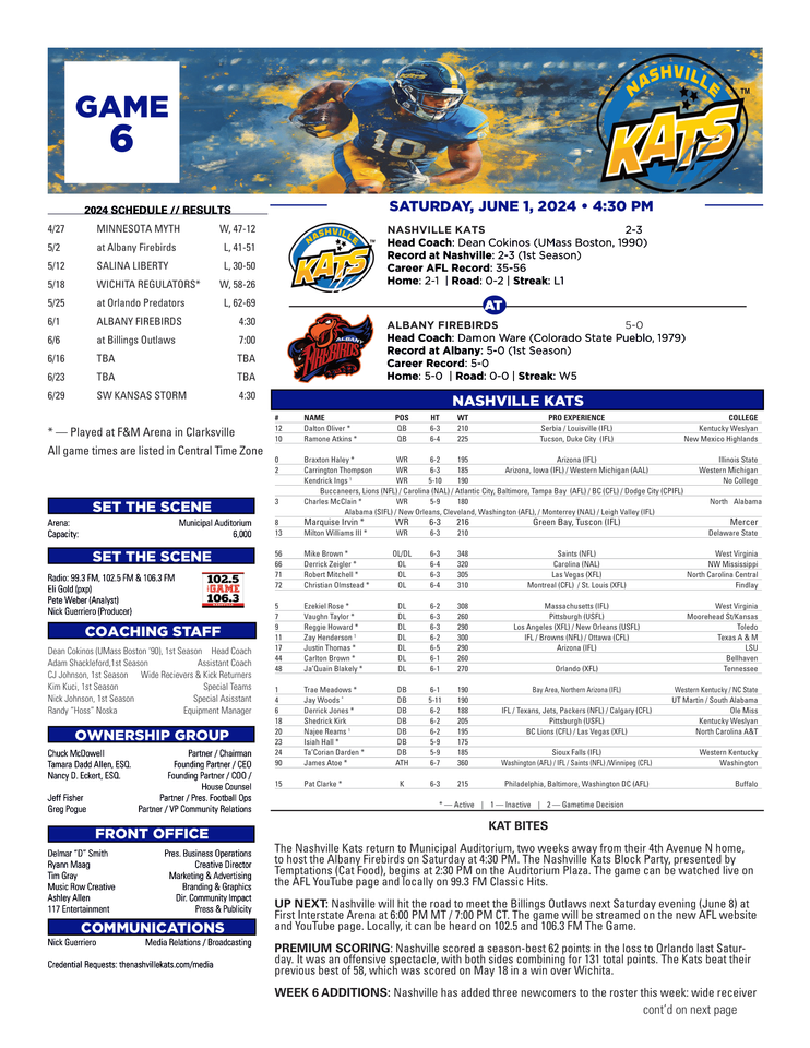 NASHVILLE — The Nashville Kats return to Municipal Auditorium after two weeks away from their 4th Avenue North home to host the Albany Firebirds on Saturday at 4:30 p.m. The Nashville Kats Block Party, presented by Temptations (Cat Food), begins at 2:30 p.m. on the Auditorium Plaza. The game can be watched live on the AFL YouTube page and locally on 99.3 FM Classic Hits.