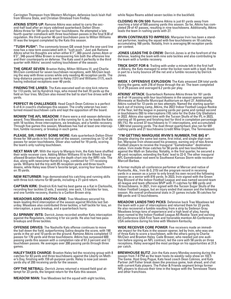 MOWIN’ THE AFL MEADOW: If there were a mid-season defensive award, Trea Meadows would be in the running for it, as he leads the Kats with 18 tackles, three interceptions, six breakups, and a fumble recovery. Through five games this season, Meadows has had at least one interception, fumble recovery, or breakup in each game.