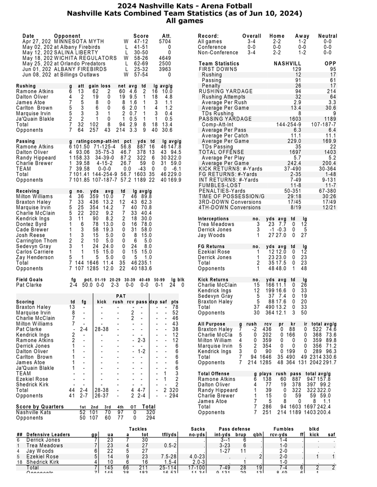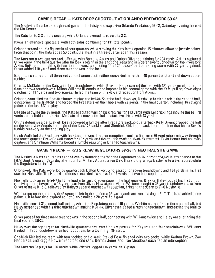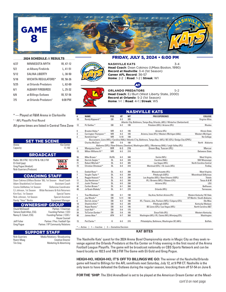 ORLANDO — The Nashville Kats' quest for the 2024 Arena Bowl Championship starts in Magic City as they seek revenge against the Orlando Predators at the Kia Center on Friday evening in the first round of the Arena Football League Playoffs. The game will be broadcast nationally on CBS Sports Network and can be heard locally on 102.5 and 106.3 FM The Game with Eli Gold and Greg Pogue.