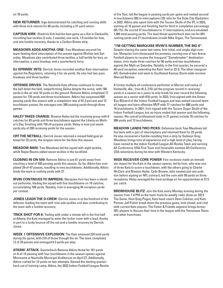 HIP TO BE WIDE: The Kats’ wide receiver corps made it easy for Hippeard to readjust to the speed of an arena football game against Billings. Milton Williams III and Marquise Irvin combined for 21 receptions and two touchdowns. Irvin led the team with 141 receiving yards, and Williams became Hippeard’s favorite target with 11 catches. Kendrick Ings and Braxton Haley each scored two touchdowns, combining for 103 yards. Ings added 69 yards on kick returns, including a 31-yard run on the opening kickoff.