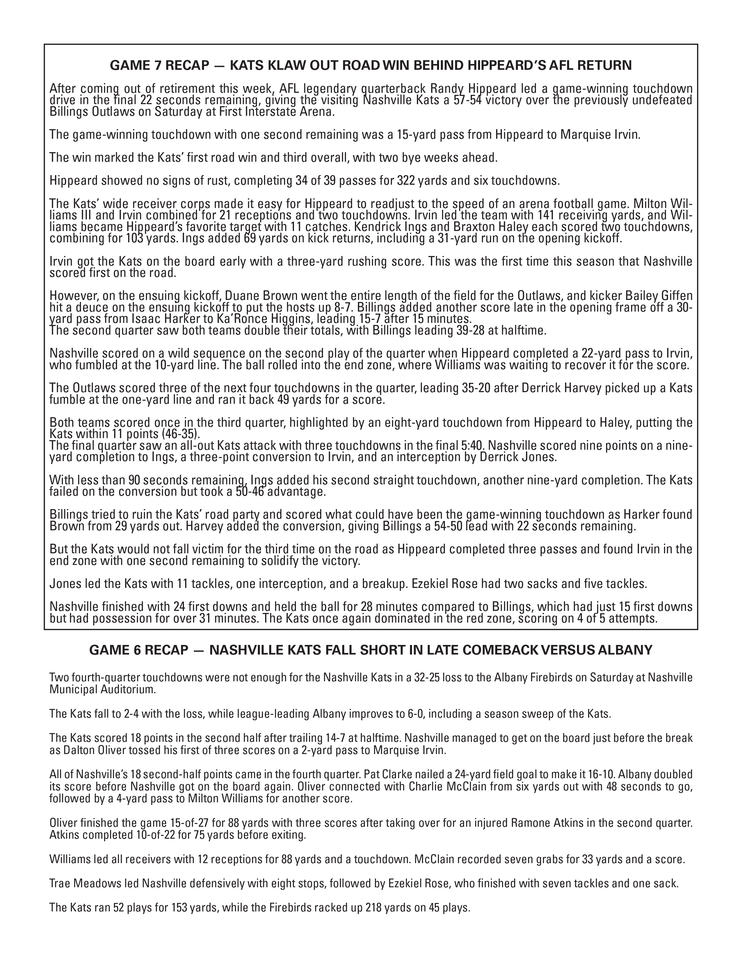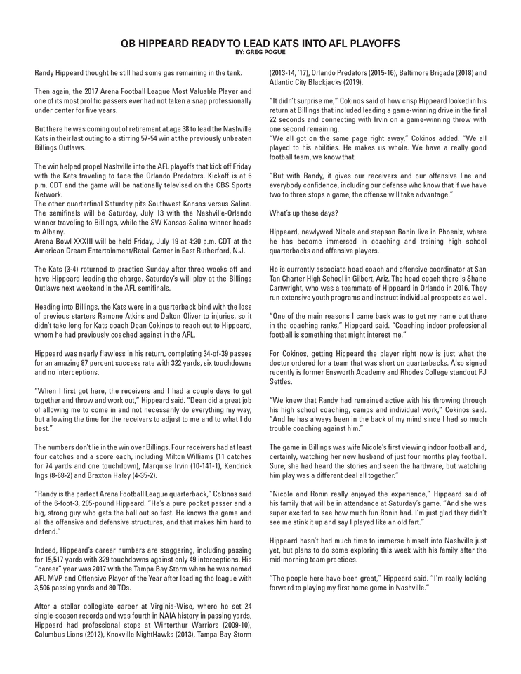 HIP HIP HOORAY: In his first game since 2019, Randy Hippeard led a four-play, 47-yard game-winning drive to secure a victory for the Kats over Billings on June 8. Hippeard finished with 322 passing yards and six touchdowns.