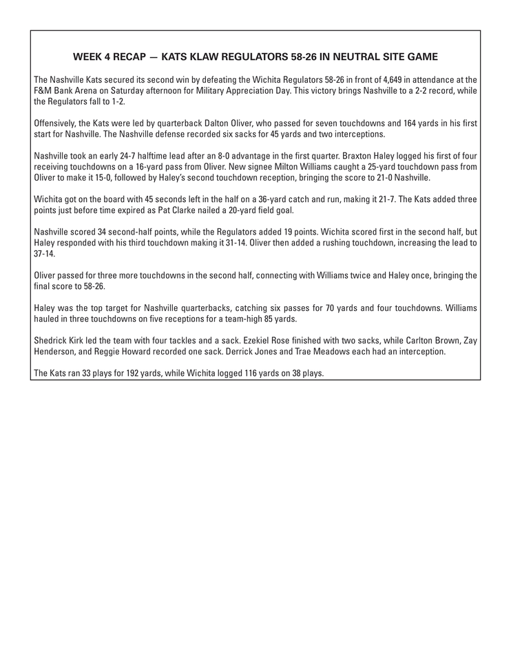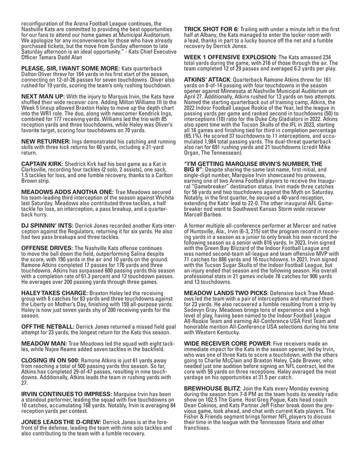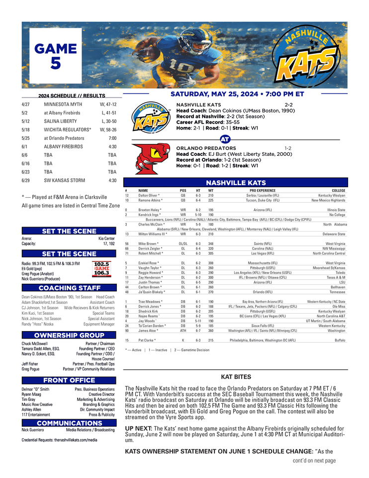KATS OWNERSHIP STATEMENT ON JUNE 1 SCHEDULE CHANGE: "As the reconfiguration of the Arena Football League continues, the Nashville Kats are committed to providing the best opportunities for our fans to attend our home games at Municipal Auditorium. We apologize for any inconvenience for those who have already purchased tickets, but the move from Sunday afternoon to late Saturday afternoon is an ideal opportunity." - Kats Chief Executive Officer Tamara Dadd Alan