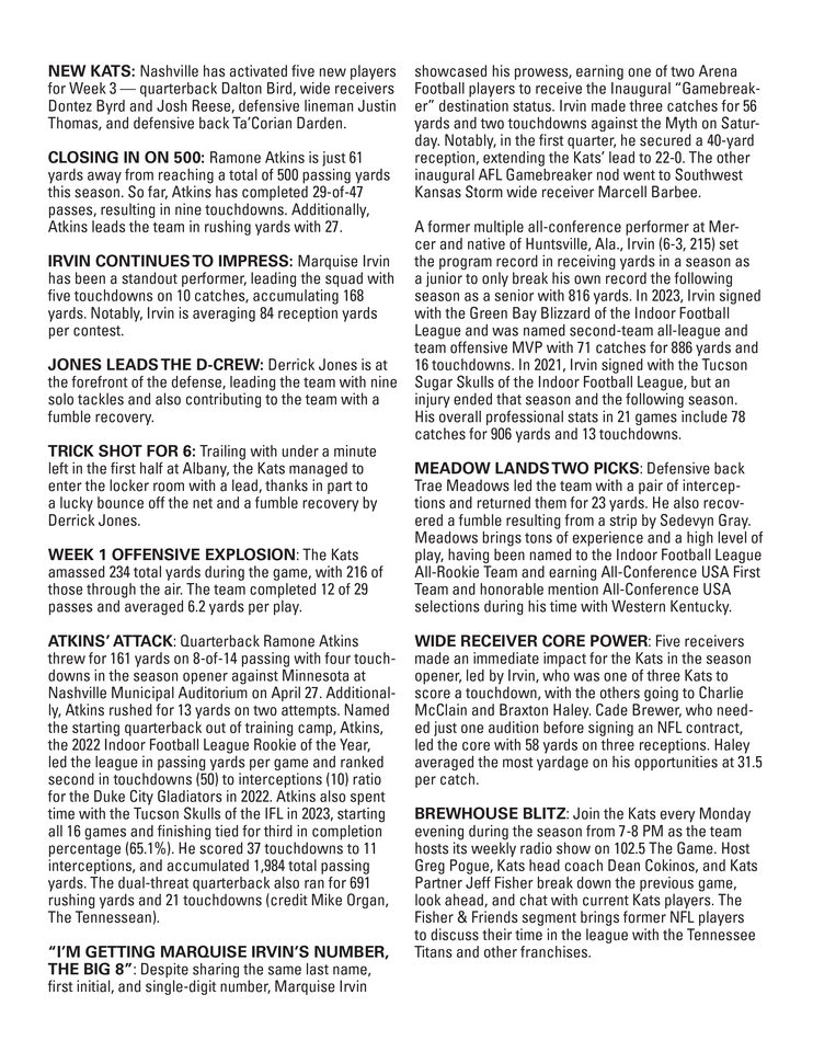 NEW KATS: Nashville has activated five new players for Week 3 — quarterback Dalton Oliver, wide receivers Dontez Byrd and Josh Reese, defensive lineman Justin Thomas, and defensive back Ta’Corian Darden.