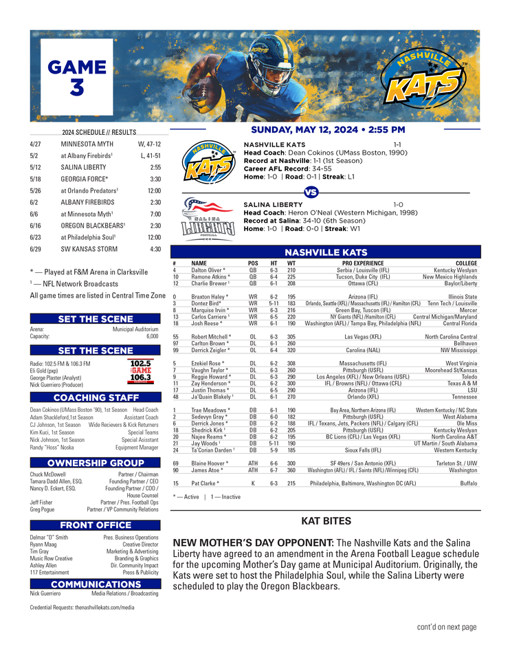 NEW MOTHER’S DAY OPPONENT: The Nashville Kats and the Salina Liberty have agreed to an amendment in the Arena Football League schedule for the upcoming Mother’s Day game at Municipal Auditorium. Originally, the Kats were set to host the Philadelphia Soul, while the Salina Liberty were scheduled to play the Oregon Blackbears.