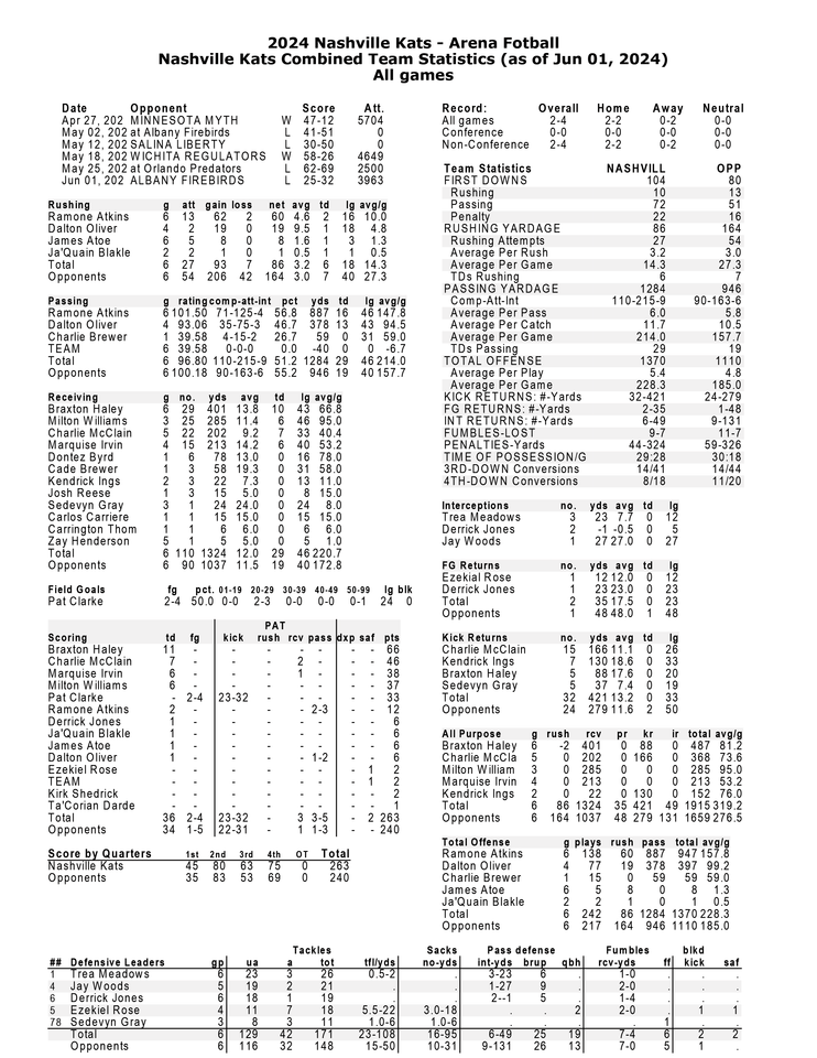 NASHVILLE – Two fourth-quarter touchdowns were not enough for the Nashville Kats in a 32-25 loss to the Albany Firebirds on Saturday at Nashville Municipal Auditorium.